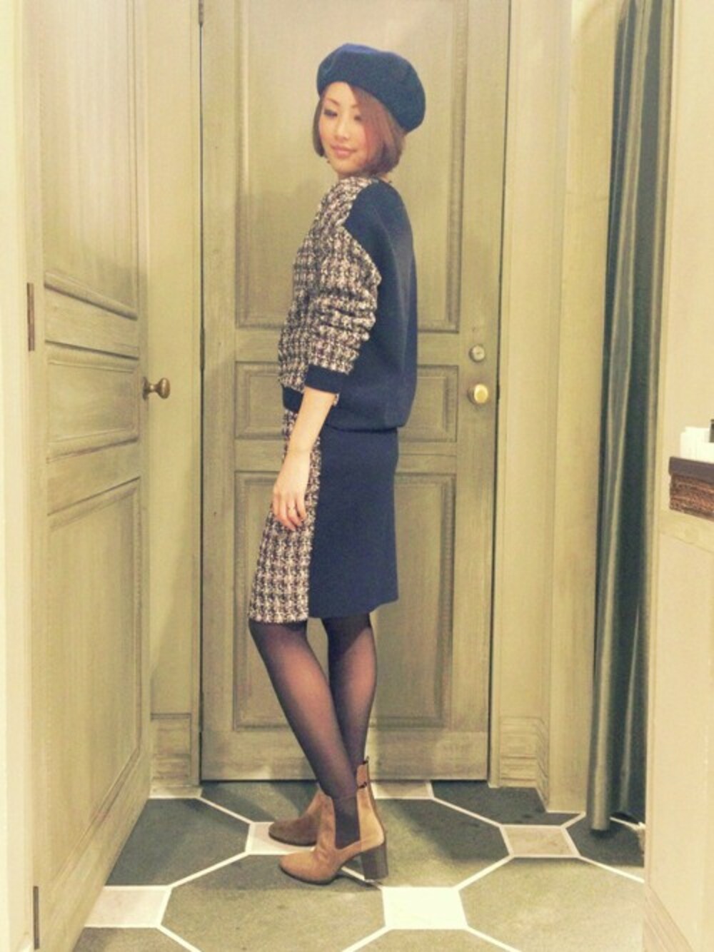 綺麗めなセットアップにベージュのサイドゴアブーツを合わせてカジュアルダウン。