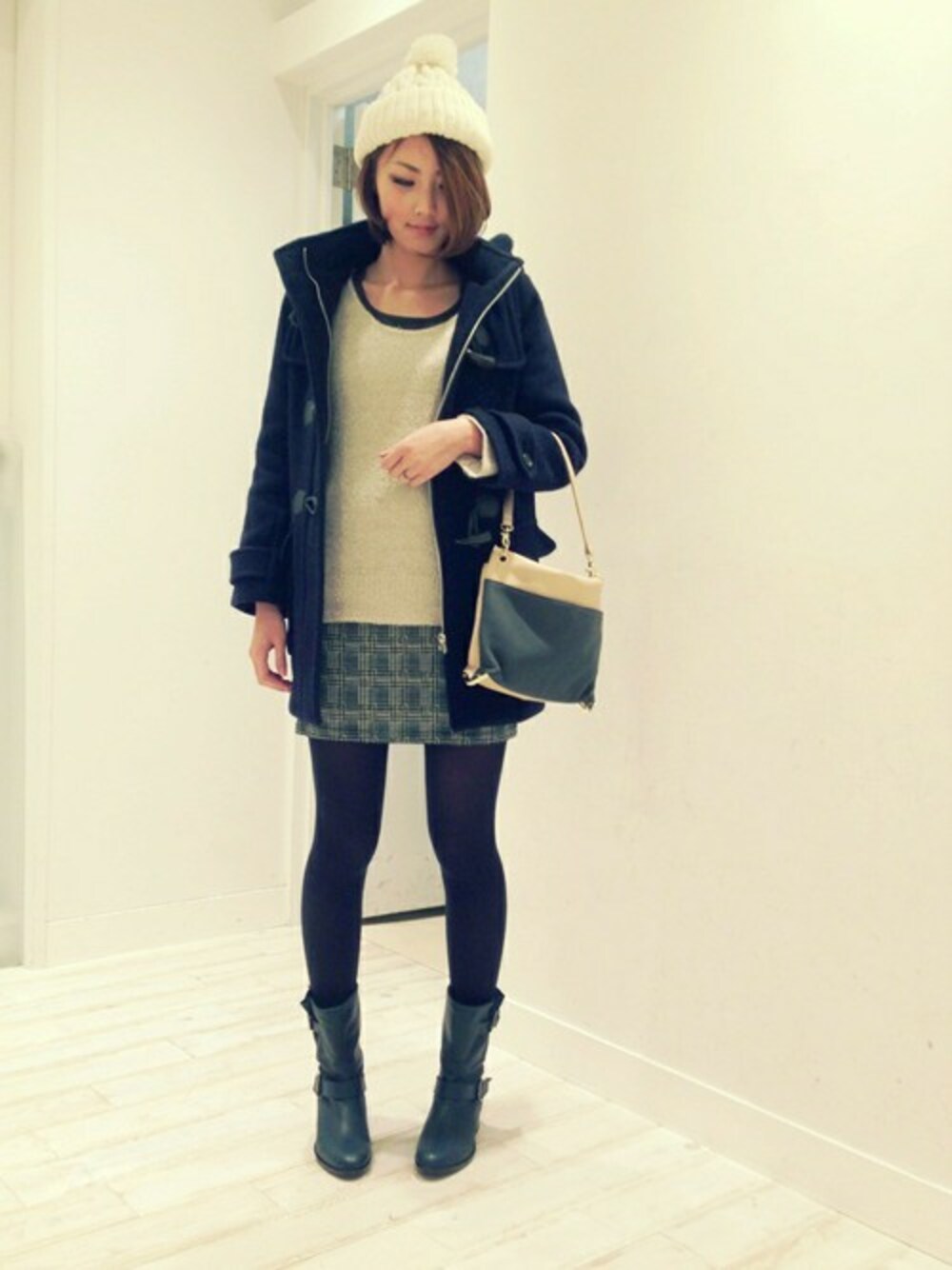 ホワイト×ネイビーで統一したコーディネート。冬アイテムもカラーを柔らかくする事で春らしく♪