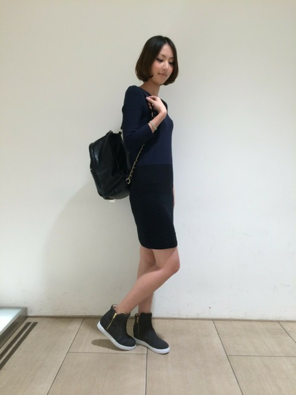 キレイ目ワンピースも、スニーカーとリュックでカジュアルダウン♪インヒールで美脚効果抜群ですよ☆