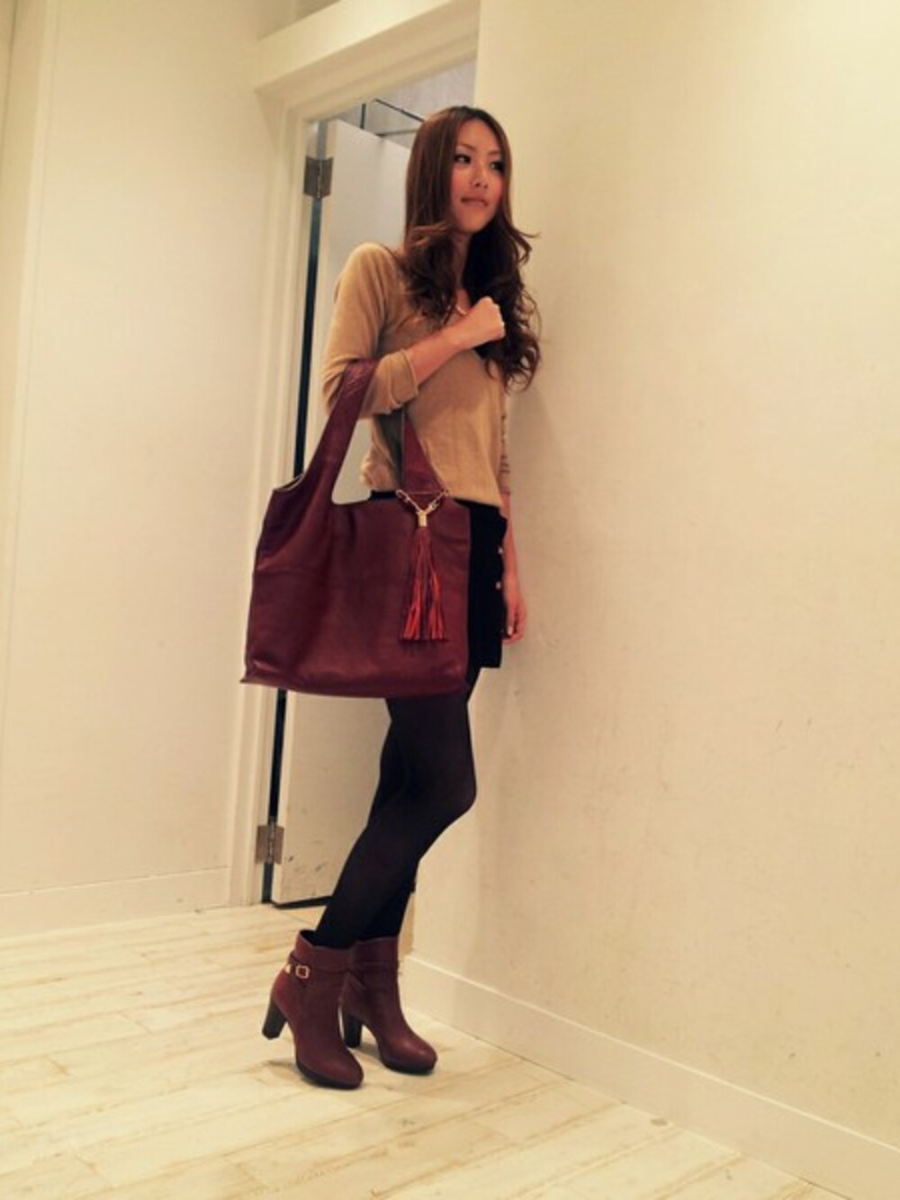スッキリしたシルエットながら、ベルトがアクセントになりオシャレなショートブーツ。 タッセル付きのトートバッグとカラーを合わせ、統一感のあるコーディネートに!