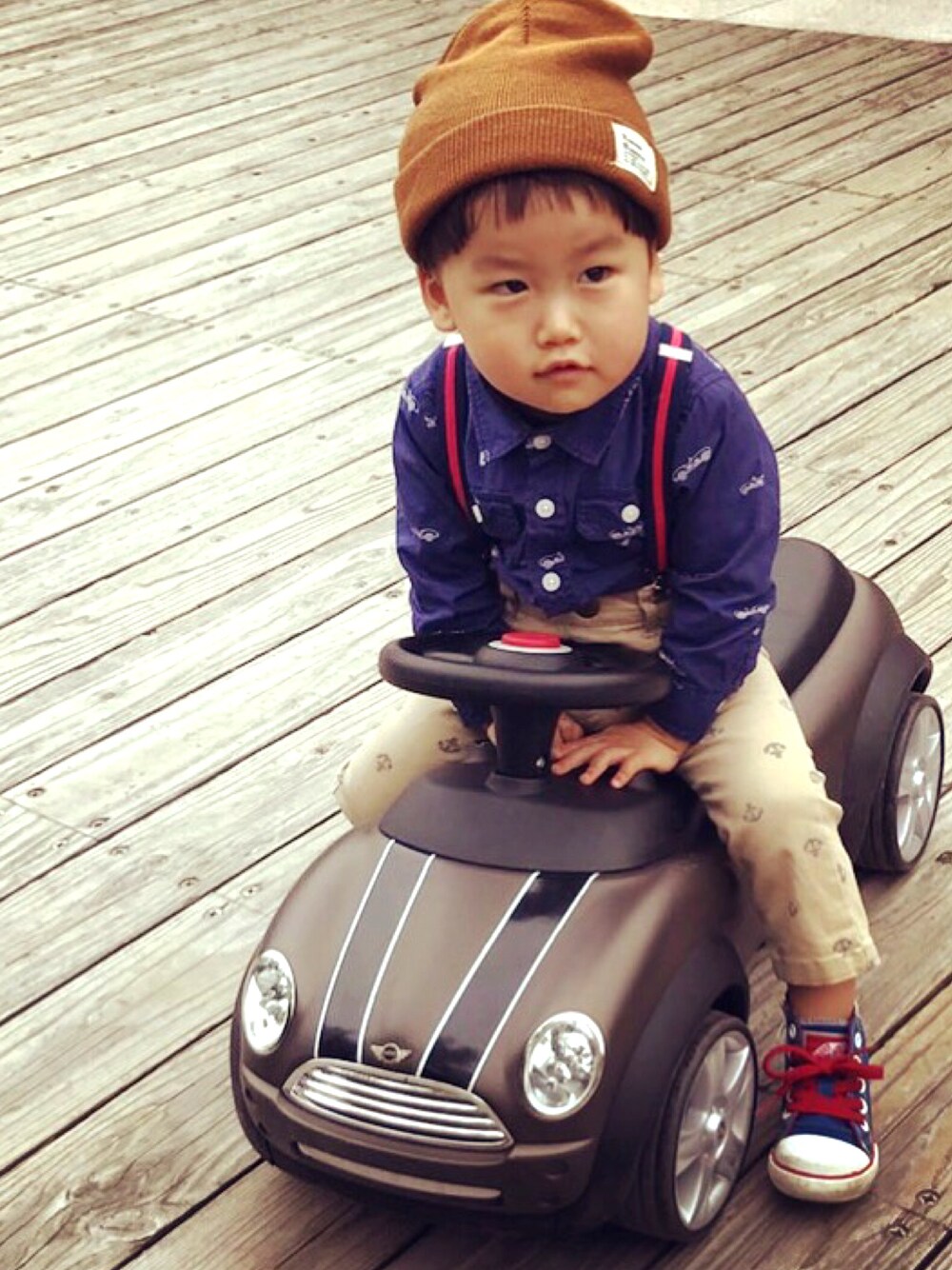 サスペンダーを使ってトラッドスタイル 柄に柄だけどうるさくならないように色味を正反対に 帽子と靴はカジュアルにして少し外したコーデに