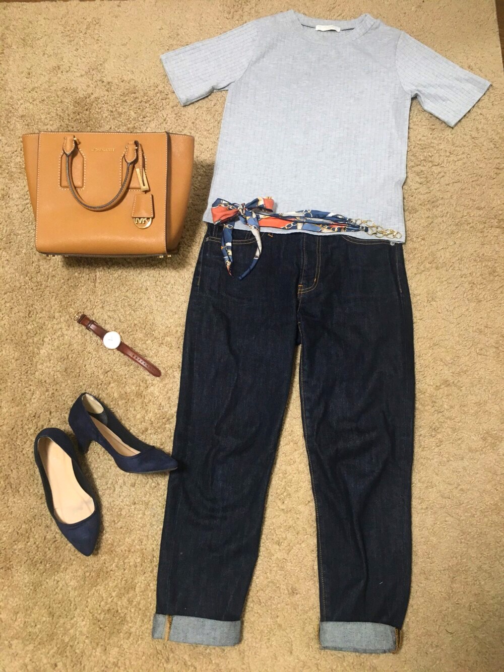 今日のコーディネート🙊💕 シンプルなので時計とバンダナベルトで大人っぽく出来ればと思い…スタイル良くなって着こなせるように頑張ります🙄 グレーでも脇汗があまり目立たないDiscoat Parisienのトップスは強い味方♡