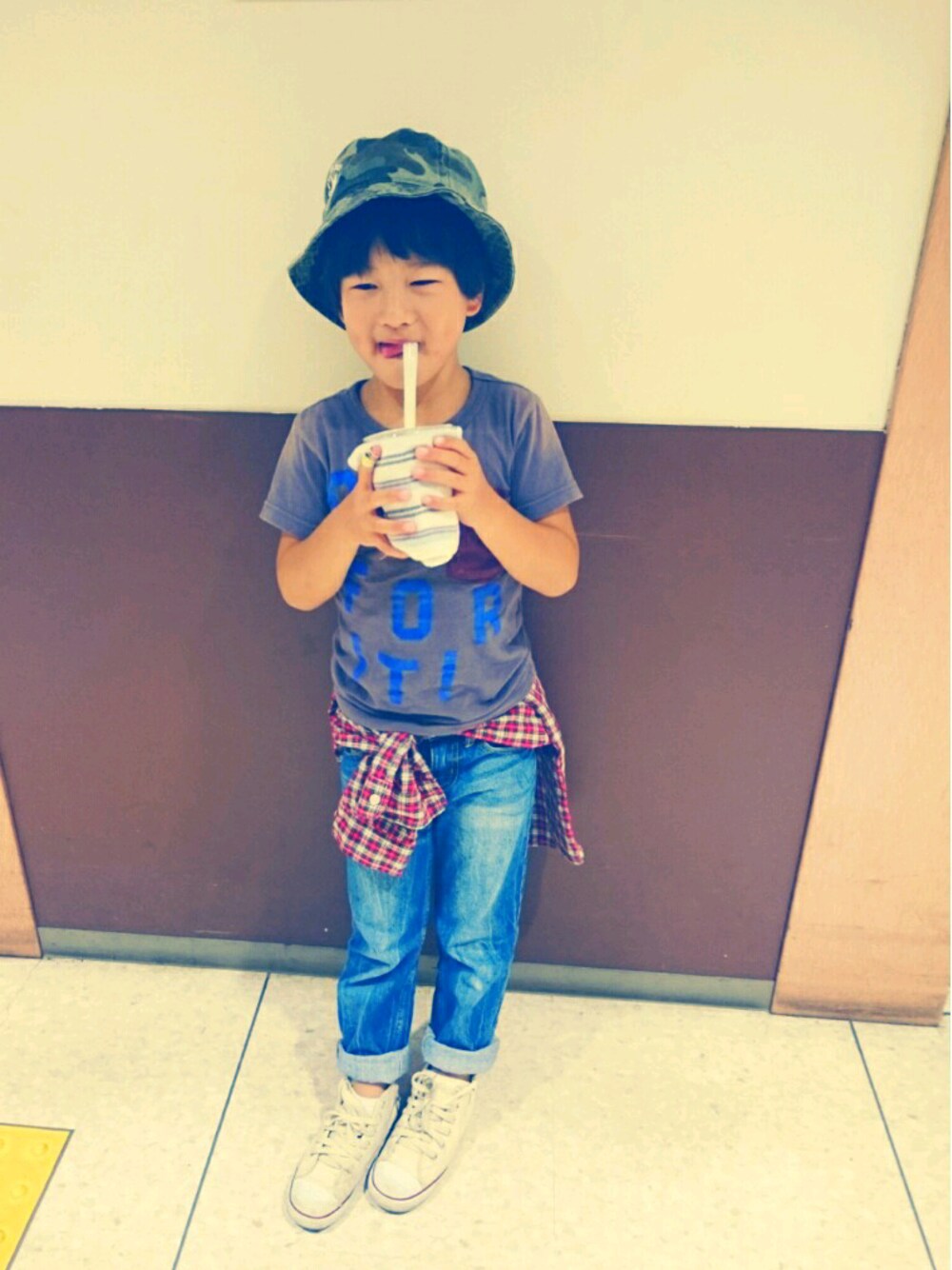 冷房が強いスーパーでは羽織ものが欠かせません。 帰りにシェイクを買ったら「手が冷たーい💦」と言うのでハンカチを巻いてあげました! 寒がりすぎる息子でした☝笑