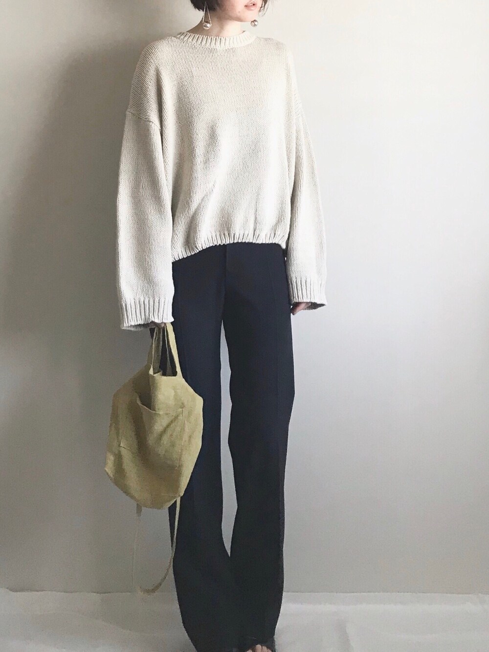 ブラック系のスラックスを着用したレディースの春コーディネートの1枚目の写真