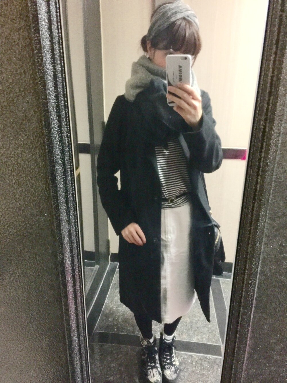 やはり私はモノトーンコーデが落ち着くなあ。 最初はコートの下にパーカー着てたのですが、 買い物でHOT!HOT!になったので脱いだら更にシンプルになりました。 髪は最近ずっとヘアバンド×簡単お団子。 靴はNICE CLAUP。 可愛いけど、下腿三頭筋ギプス、もしくは足かせばりに重いので、今脚がダルダルさん。