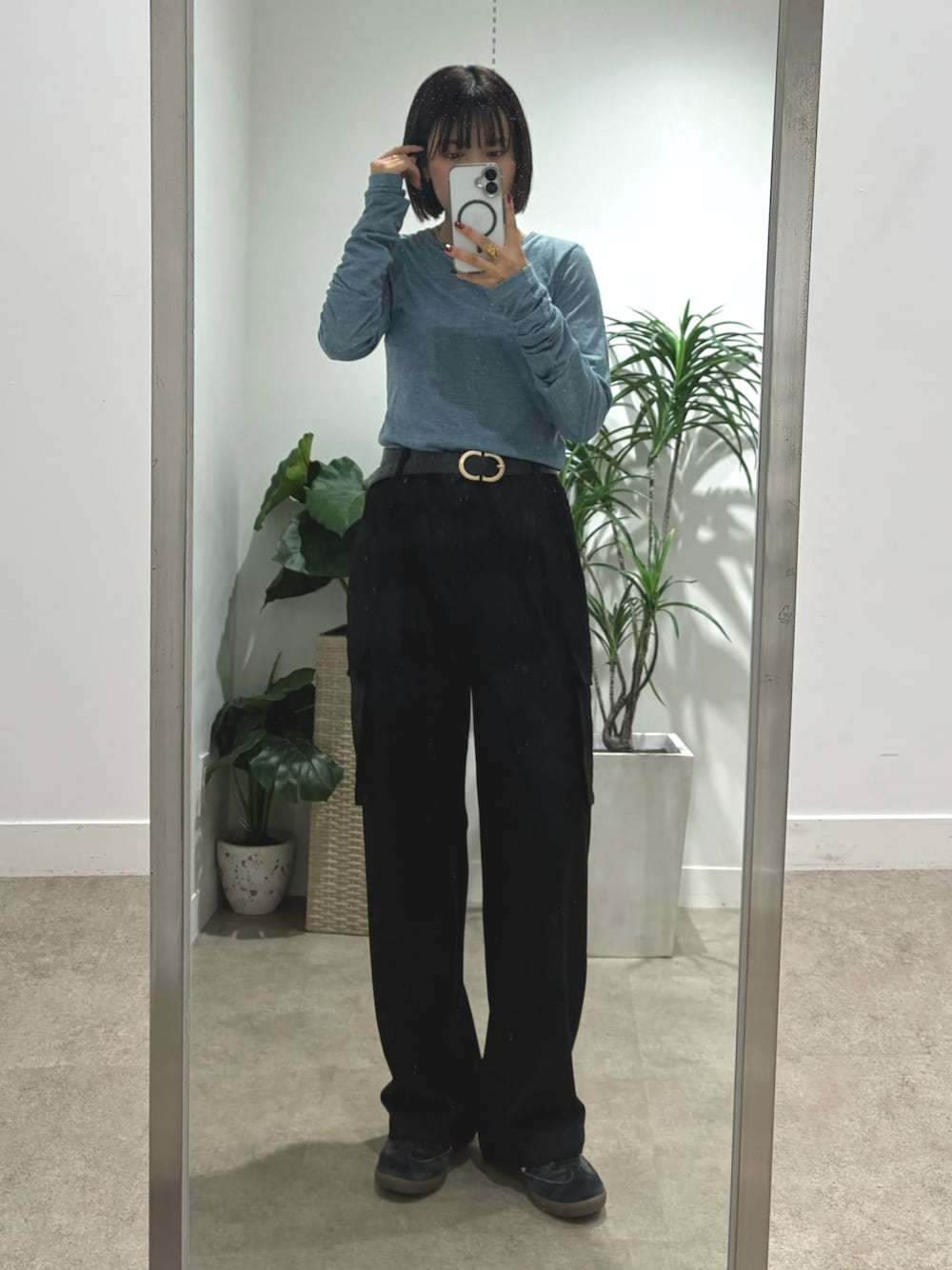 温度調節が難しい日に シアートップスってめちゃくちゃ便利ですよね🌼 袖のクシュクシュ感とちょっとメランジっぽい カラーが可愛くてお気に入りです🩵 カーゴパンツと合わせて ちょいモードな雰囲気にしてみました!