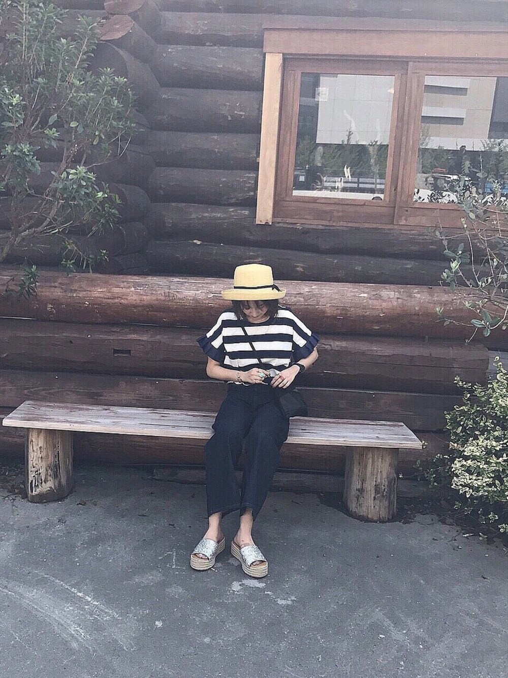 ♡のTシャツ/カットソー「袖リボンプリーツコットンブレンドボックスシルエット半袖ボーダーカットソー」を使ったコーディネート
