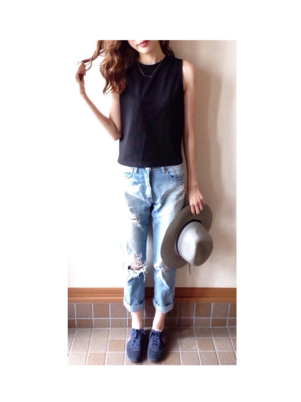 NIKE〜〜〜 ダメージデニムパンツ〜〜〜 プチハイネック〜〜〜 サンダル合わせればよかったなぁと後悔😠 最近格好がマンネリ😢 黒白と、 ジーンズにかたよりますーーー泣 土曜日は、花火大会💓 友達といってきます笑