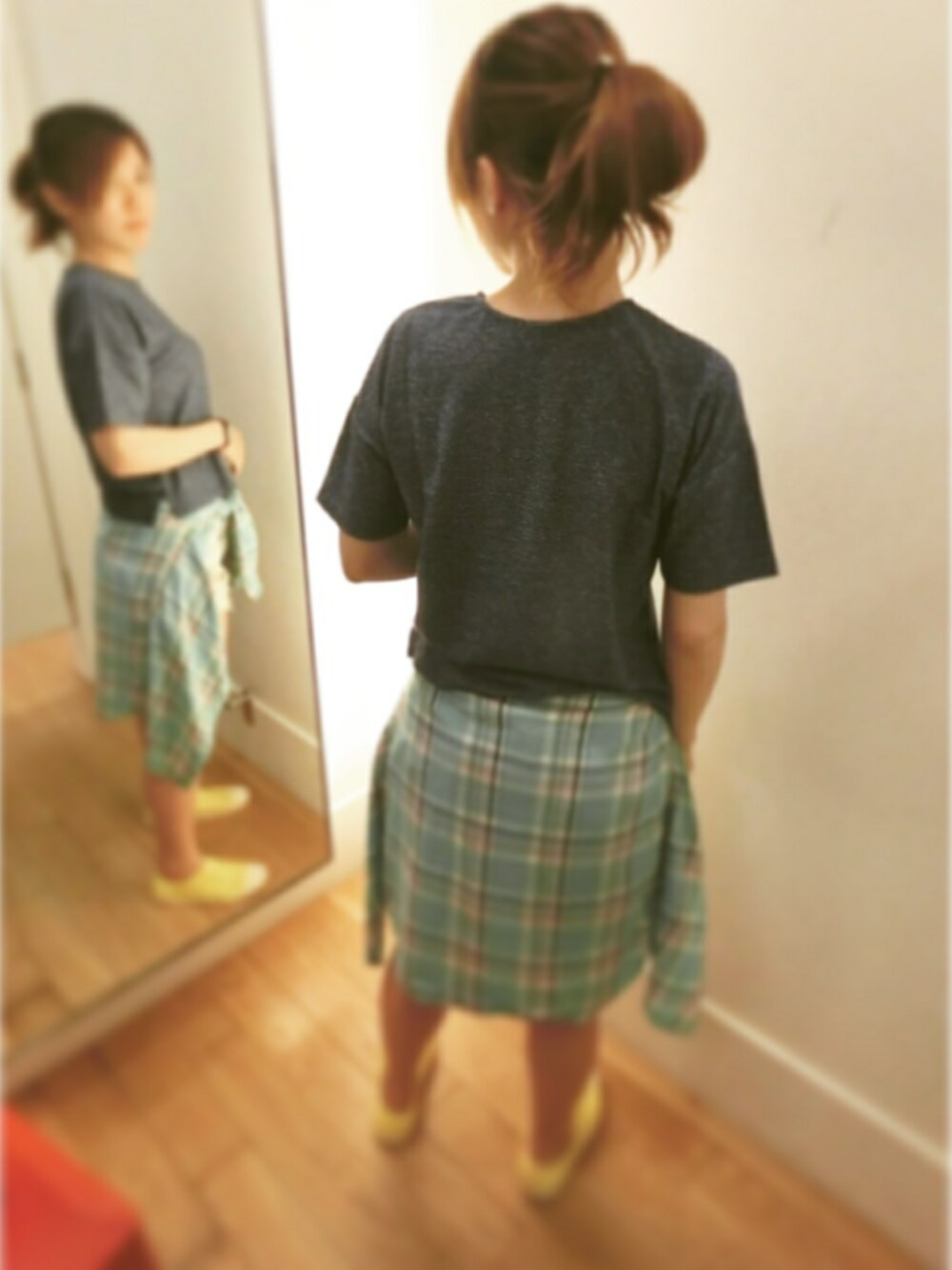 素色短版上衣 / 淺牛仔短褲 / 格子襯衫綁在腰際