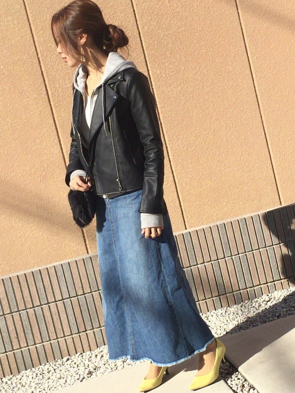 こんにちわ❣️ グレーパーカーとデニムのロンスカ⭐︎ ライダースを装着🙋 いつも仲良くしてくれてる 超絶オシャレなフォロワーさんの ゆきっぺ♡が 黄色パンプス履いてるの見て 久々に履きたくなったコーデです✨💛 黄色パンプス 春まで眠るかなーって思ってたけど 今も使えるんですねぇ(о´∀`о)💛 るんるん💛 ゆきっぺありがとう(〃ω〃)💛❣️ 今日もありがとうございます😊✨