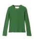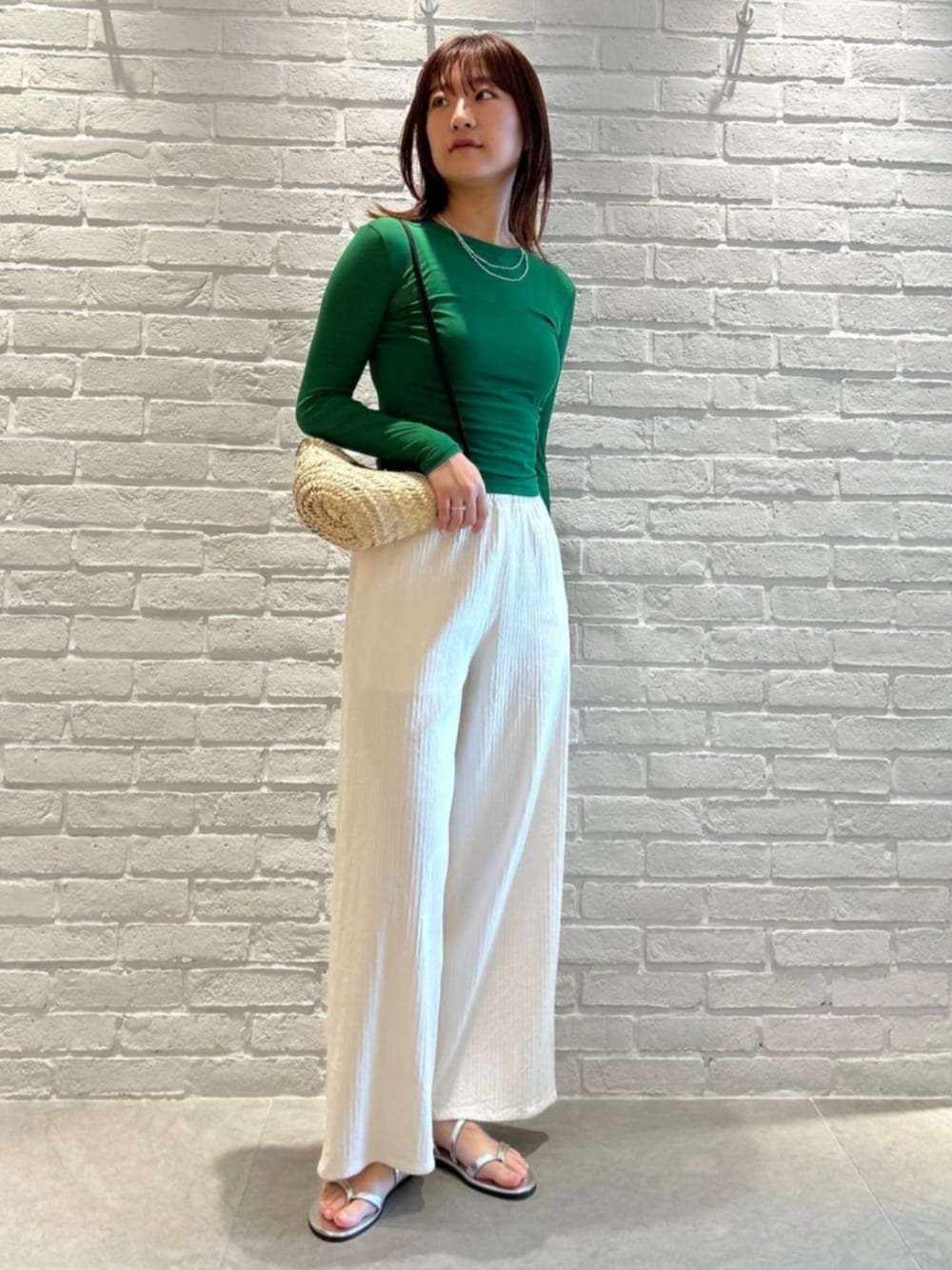 鮮やかなグリーンのカットソーは、ピタッとしたサイズ感ではありますが、透け感があるので今年らしい1着です。 白いパンツを合わせることで、よりグリーンが映えるスタイリングに。
