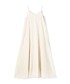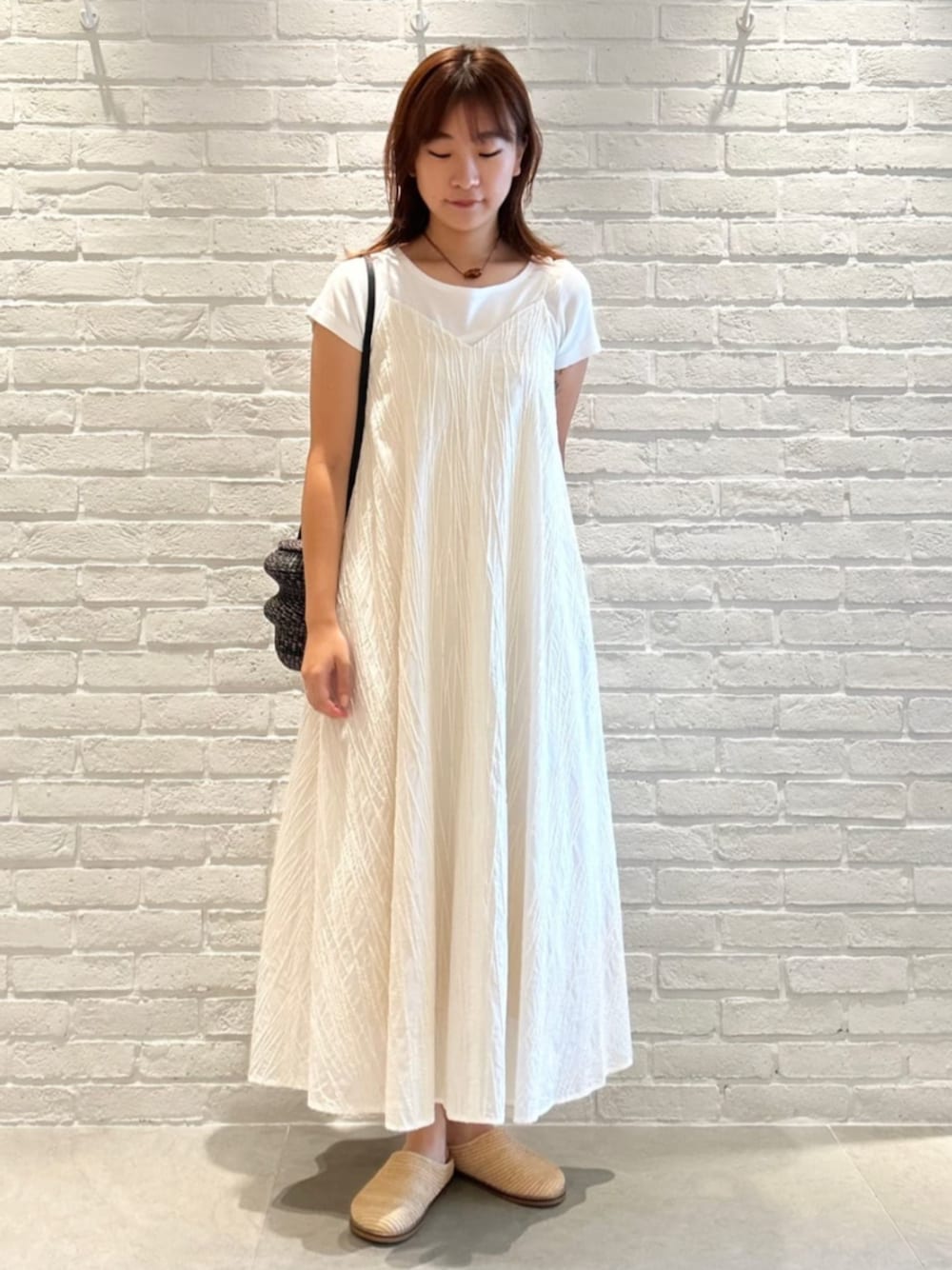 体のラインを拾わないワンピースは歩くと動きが出て、とても綺麗にお召しいただけます。 爽やかに同じトーンでまとめてみました。 ネックレスやバッグを濃い色で合わせることでアクセントを出してみました。