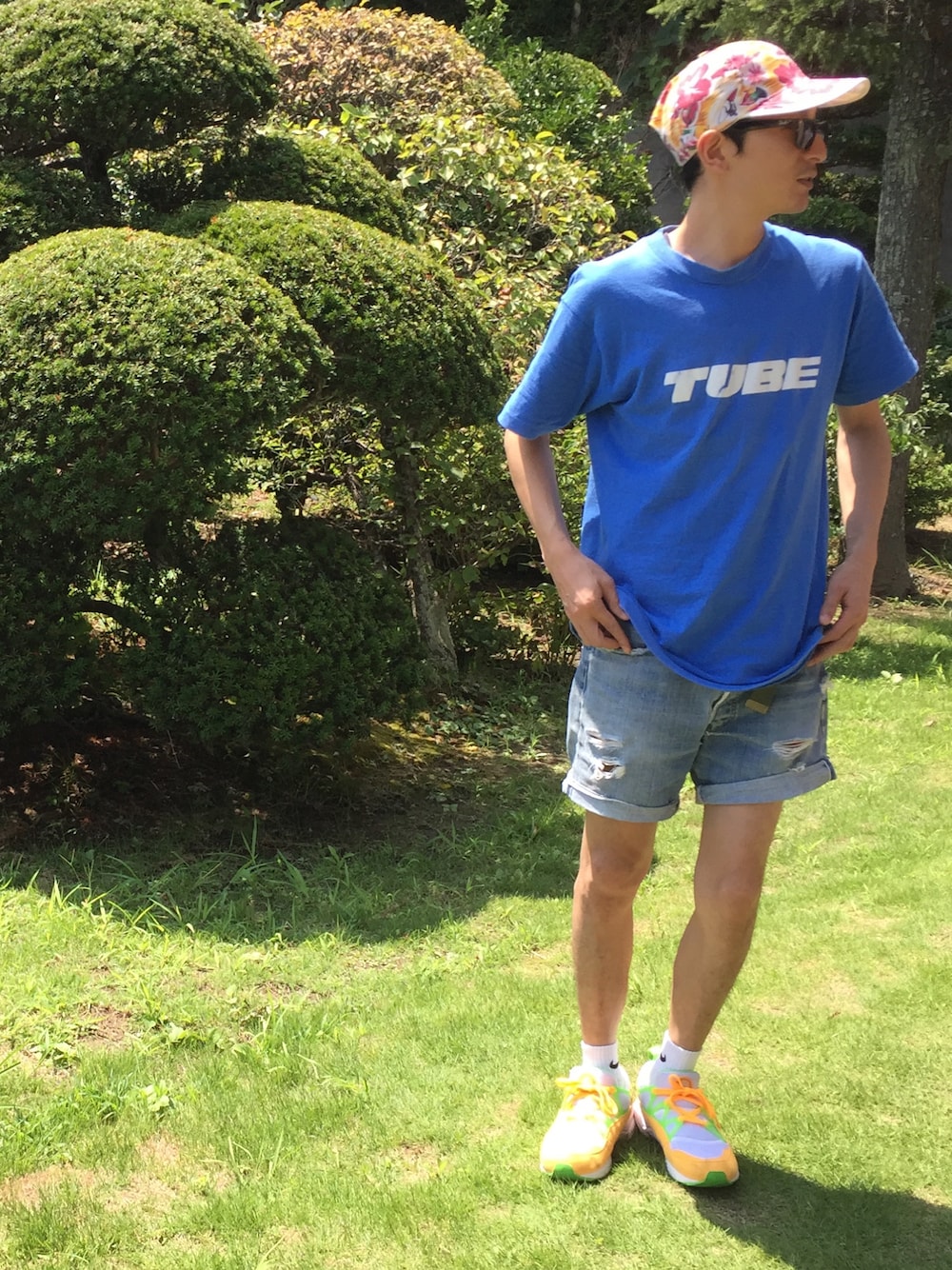 前回は【リンガーハット】でした。 今日は【と】→【常夏スタイル】です。 毎年夏に必ず着ている、 私の夏の勝負Tシャツ。 これぞ夏のバンドTシャツですね。 気分は常夏の島ですが、 妻の実家の庭です。 あー夏休み 今日は【常夏スタイル】でした。 次回は【る】です。