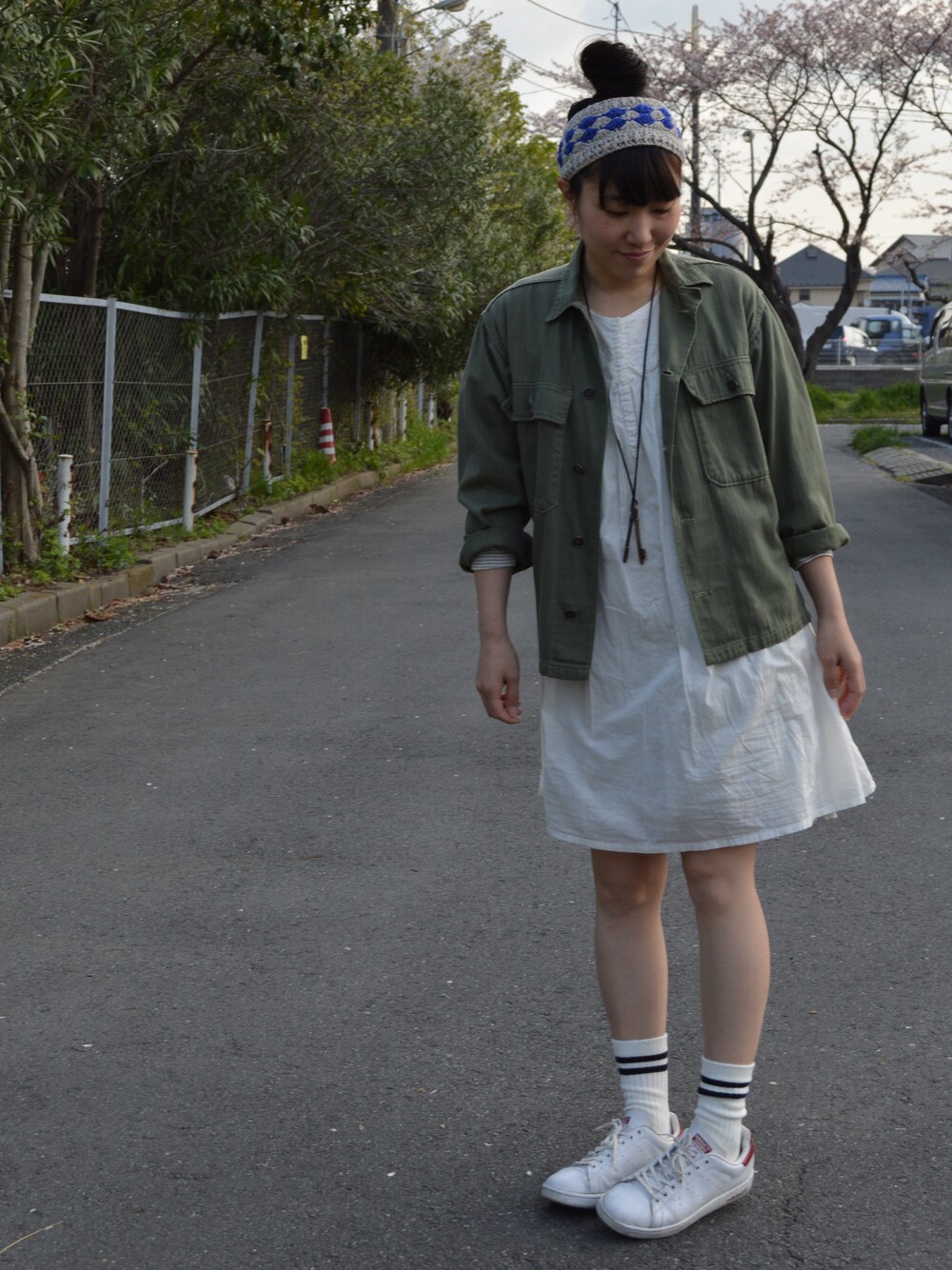 ミリタリージャケット : used ワンピース : bulle de savon 靴 : アディダス スタンスミス ヘアバンド : カオリノモリ アンティークの鍵 一日置き位のペースで、色んな白ワンピースを着ている今日この頃。 ワンピース以外にも、Tシャツ、ブラウスと、やっぱり白が好き。