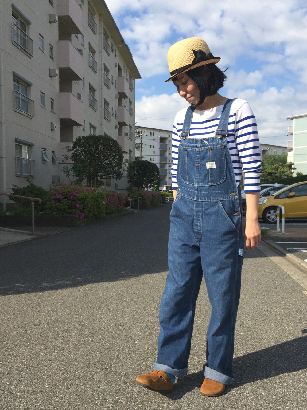 オーバーオールが着やすい季節だ!! 髪の毛ピョンとはねてるな。。。