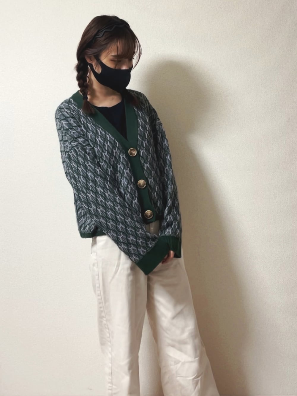 高身長×ウェーブ体型 緑のニットカーデ×白のストレートパンツ
