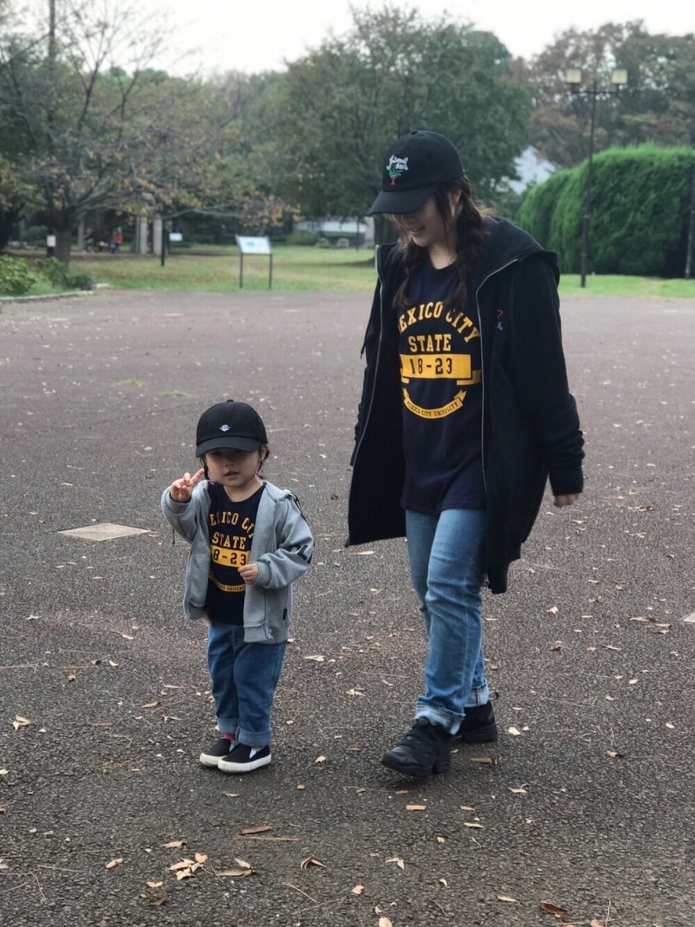 姪っ子とペアコーデ♡ Tシャツは、妹のを借りて黒キャップ、デニム、パーカー、スニーカーで髪型は三つ編みで合わせました😊 ♡、お気に入り、フォロー、ありがとうございますm(_ _)m✨