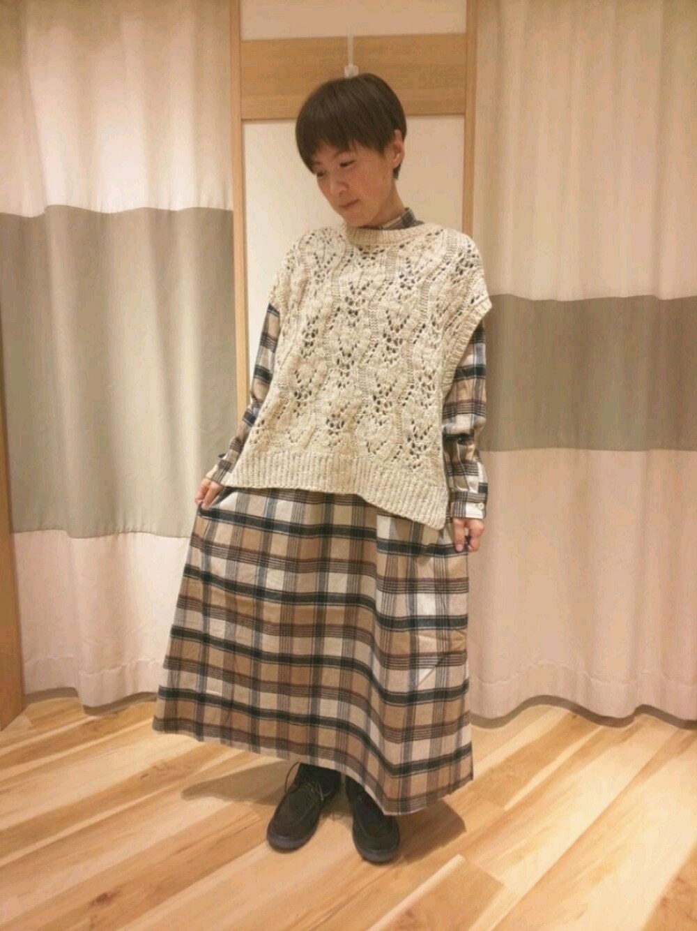むっちゃんのベスト「柄編みニットベスト」を使ったコーディネート
