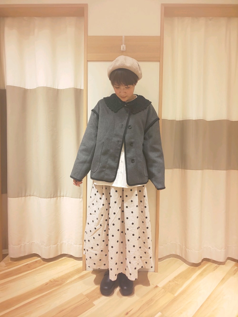 むっちゃんのノーカラーコート「パイピングショートコート」を使ったコーディネート