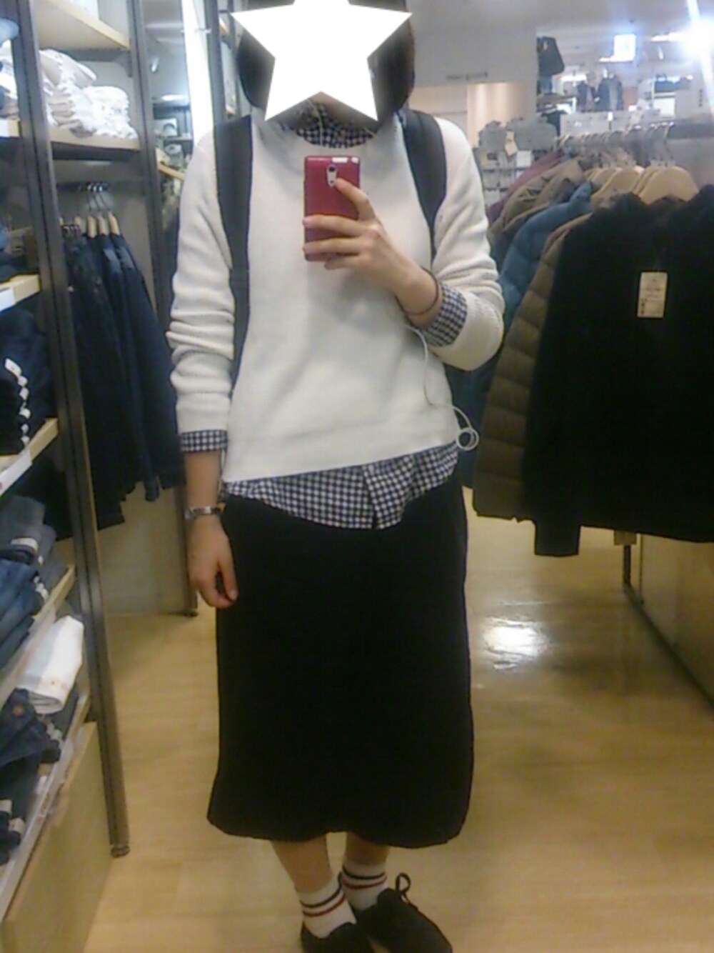 シャツがだらしなくなっていますが.... 紺と白と黒の大好きな組み合わせです。 紺のスカートはコーデュロイであったかく。 シャツ:UNIQLO ニット:g.u. スカート:不明 リュック:g.u. シューズ:Vans