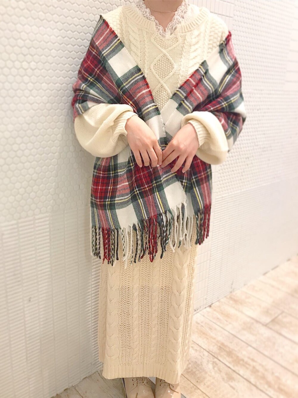 流行りのワントーンコーデ!!! ホワイトでまとめてみました💜 ケーブルニットとケーブルニットスカートを組み合わせてワンピース、セットアップのように着こなしてます💜💜💜