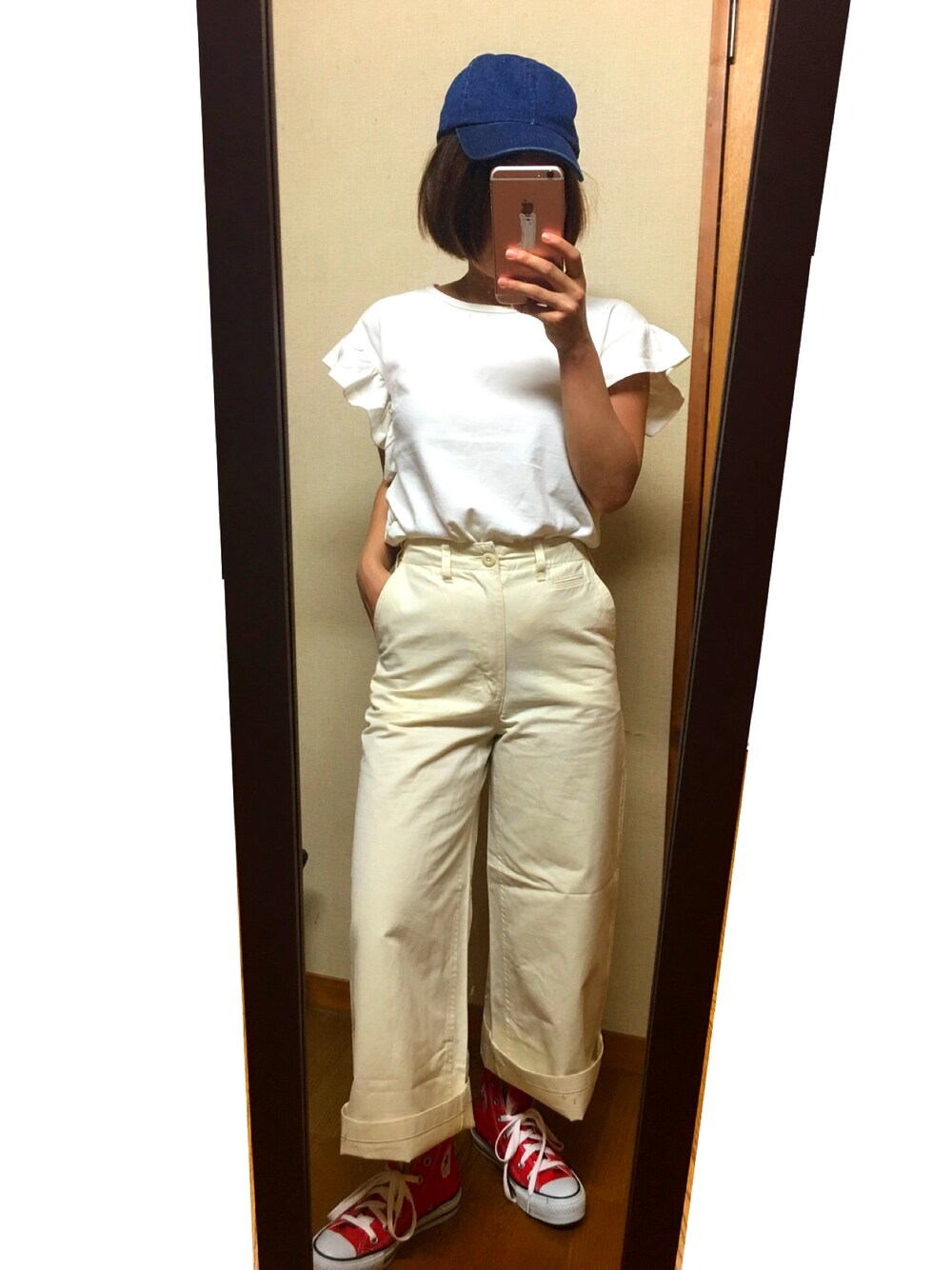 今日届いたGU!🙋試着です! チノワイドパンツ590円裾直しをまたまたイロチ買い🙈 トップスはGUのフリルスリーブT1490円 ベルトが欲しいところ💥 いったいGUでどこまでいけるのか、、