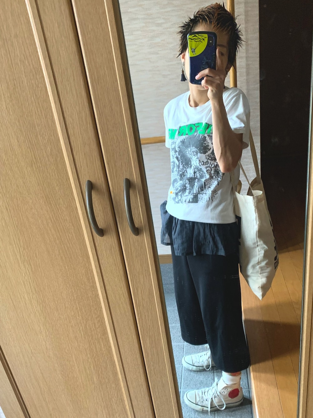 娘を妹の働く美容院へ ハードなメッセージのプリントTをインナータンクのフレアとキレイめパンツででちょっとモードなstreet styleに 最近のマイブームはベリーショートの髪の毛をソフトモヒカンセットにすること笑 何年かぶりに妹以外の人に髪の毛切ってもらったあとやから、美容院行くのドキドキやなぁ笑
