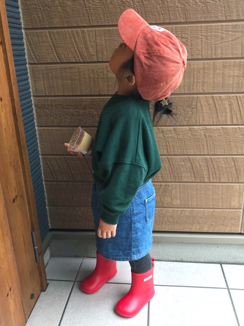 初投稿! お買い物後、片手にプリンで🍮笑 雨だったので、長靴コーデ♪ ダイソーのコーデュロイキャップ、これで200円はすごい! トップスのスウェットは、シンプルだけど、シルエットが激かわです❤️