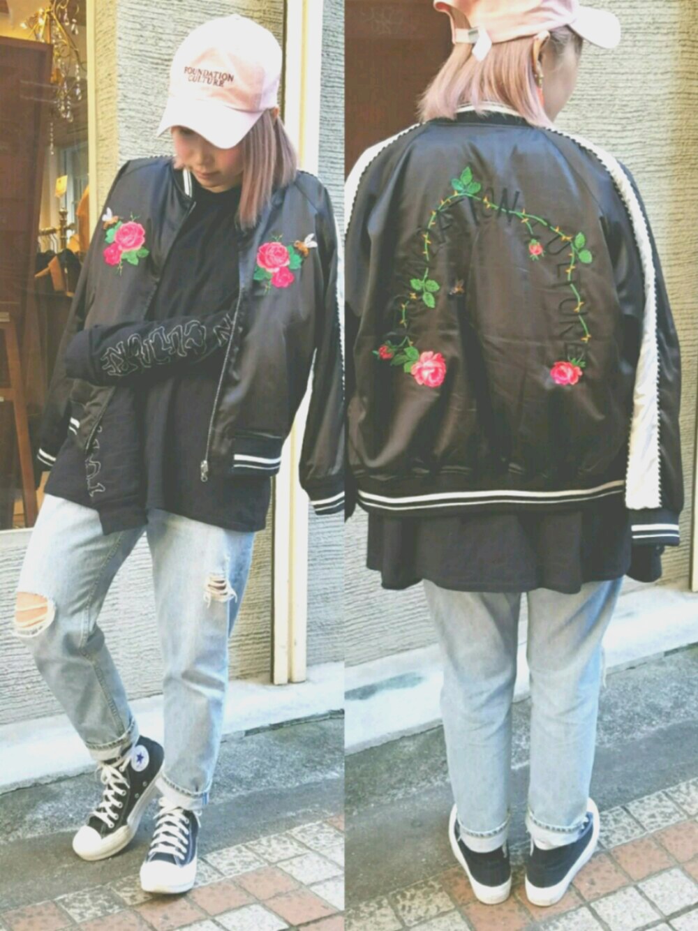 蜂とバラの刺繍がばりかわいいスカジャンにロンTとペグトップパンツでストリートスタイル(๑•᎑•๑) スカジャンは刺繍が女の子らしいのでレディライクな服にも合わせやすくてオススメです♡