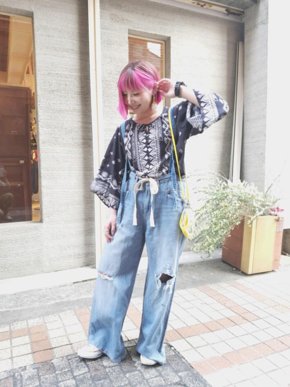 刺繍柄のブラウスはエスニックな雰囲気で夏にぴったり(´。✪ω✪。`) お素材はレーヨン100%なのでドレープ感があります♡ 袖口が広く風に揺れてより軽やかな印象に♡ 合わせたワイドパンツは大胆なダメージがグランジスタイルにハマります(`・ω・´)b 綿麻混でこれからの時期にぴったり‼ 足をすらっと長く見せてくれますよ-(ฅ>ω<ฅ)♡ 付属のサスペンダーは取り外しもできるので肩にかけても垂らしてもサスペンダーなしで穿いてもかわいいです♪