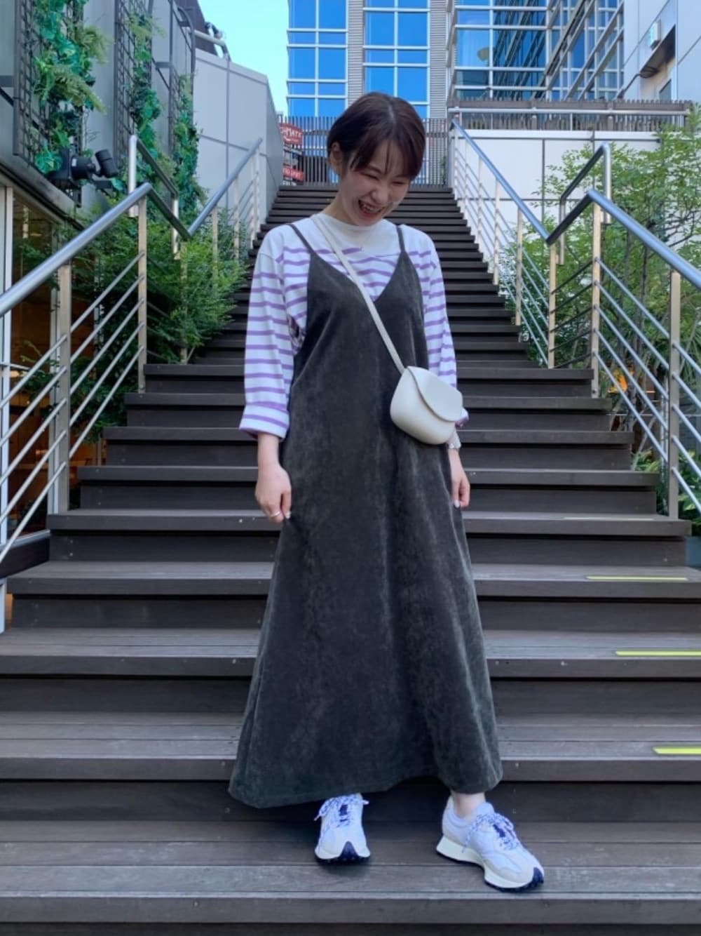 【身長】 158cm 【着用サイズ】 トップス:free ワンピース:free シューズ:24cm 【サイズ感】 トップス:ゆったり ワンピース:ゆったり スニーカー:標準的 【素材感・着心地】 トップス:程よくハリのあるコットン素材 ワンピース:柔らかいコーデュロイ素材 【スタイリングポイント】 シンプルなボーダーTシャツにコーデュロイのワンピ ースを合わせることで、張り切りすぎない女の子らしさを演出しました。紫の色でアクセントカラーを差し込んだのがポイントです。