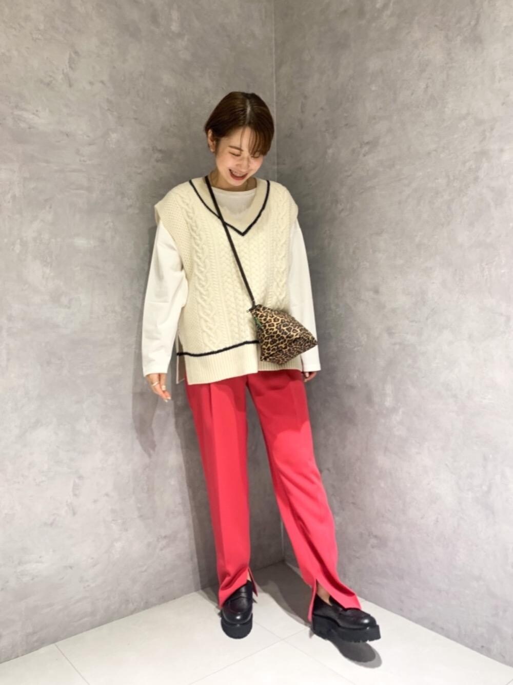 身長:158cm 普段サイズ:ボトムス36 【サイズ感】 トップス:ゆったり ベスト:ゆったり ボトムス:標準的 シューズ:標準的 【素材感】 トップス:ハリ感のあるコットン素材 ボトムス:裏地はないが厚みのあるポリエステル素材 【着心地】 トップス:さらりとした肌触りで腕まわりがたっぷりめなシルエットです。 ボトムス:ウエストゴムなので楽に着て頂けます。 【ポイント】 秋らしいニットベストに今年っぽいカラーパンツを合わせました。