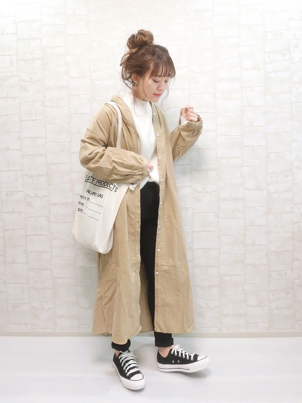 chicchimoのワンピース「AUNT MARIE'S コーデュロイバンドカラーシャツワンピース」を使ったコーディネート