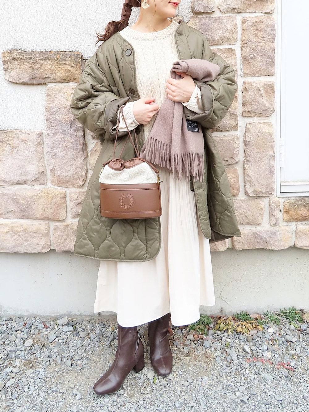 見てくださりありがとうございます。 キルティングコートで着回しコーデ🙌! コートは背面のタグがポイントになっていてお気に入り❣️ZOZOでクーポン出てます♡ dholicのワンピースは上からニットを重ね着してレイヤードコーデ👗✨着回し効くのでおすすめです♡ Instagram→wear.chicchimo いつも いいね,お気に入り,フォローもありがとうございます!