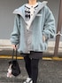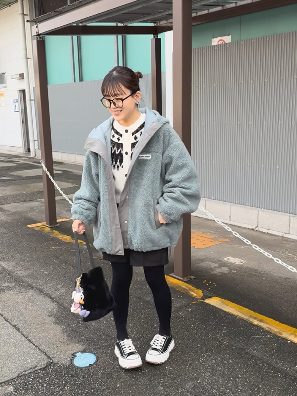 chicchimoのブルゾン「《JaVaジャバコラボ》 レトロ スポーツで最旬コーデ。スタンド フード オーバーサイズ ボア アウター」を使ったコーディネート