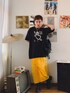 イエロー系のスカートを着用したレディースの秋コーディネートの2枚目の写真