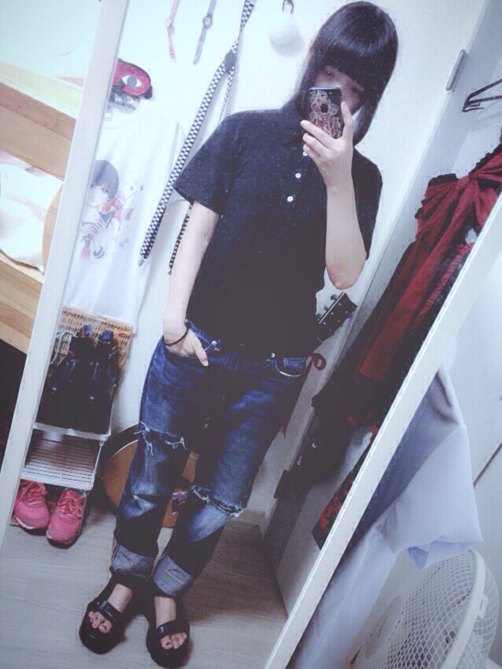 地元の古着屋さんでGETした黒のポロシャツをメインにシンプルコーデ🐼
