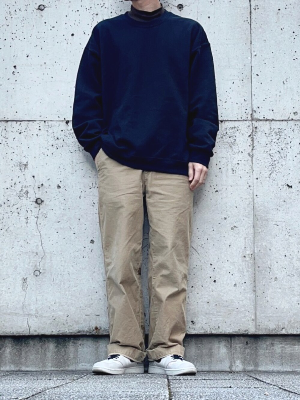 ギルダンのスウェットを着回して3日目。 インナーにモックネックを入れて少し上品に。