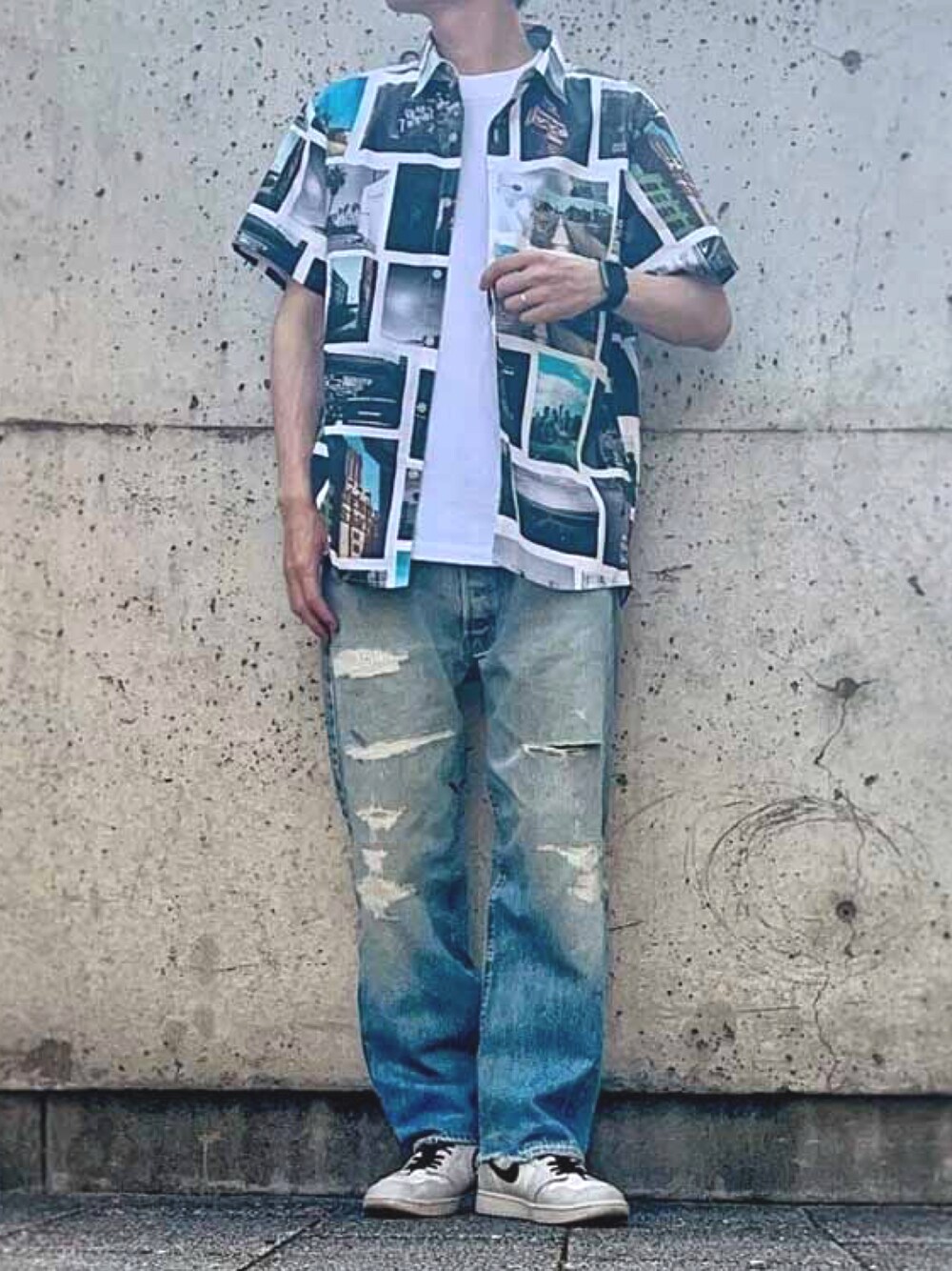 シャツが主役! 『さらっと羽織っただけ』というような感じが出したかったので、白Tにデニムパンツというオーセンティックな組み合わせ。 主役のシャツはフロントオープンで着ました。