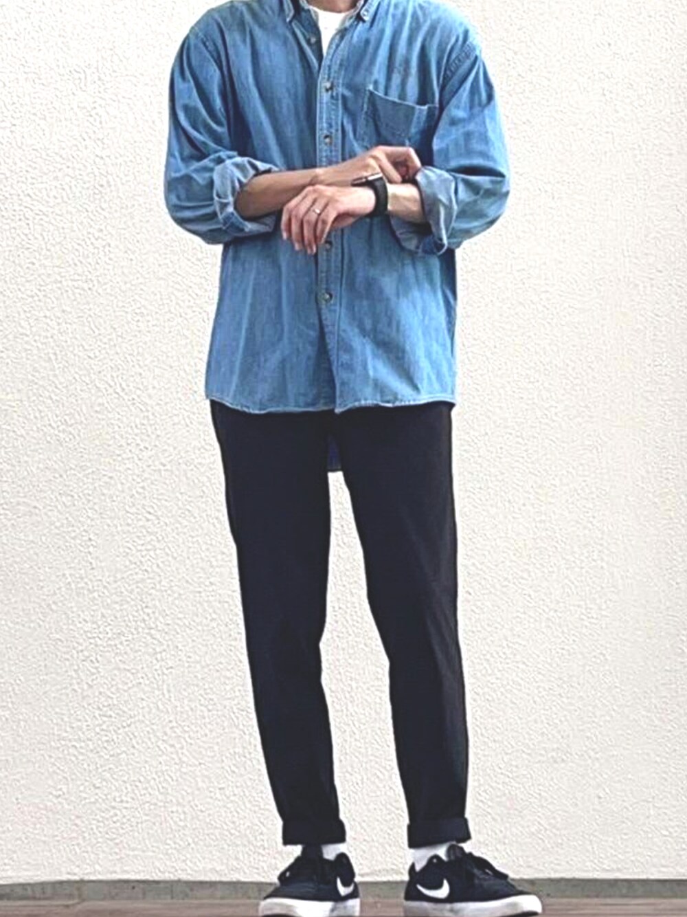 ブラック系のパンツ、ブルー系のシャツ/ブラウスを着用したメンズの秋コーディネートの1枚目の写真