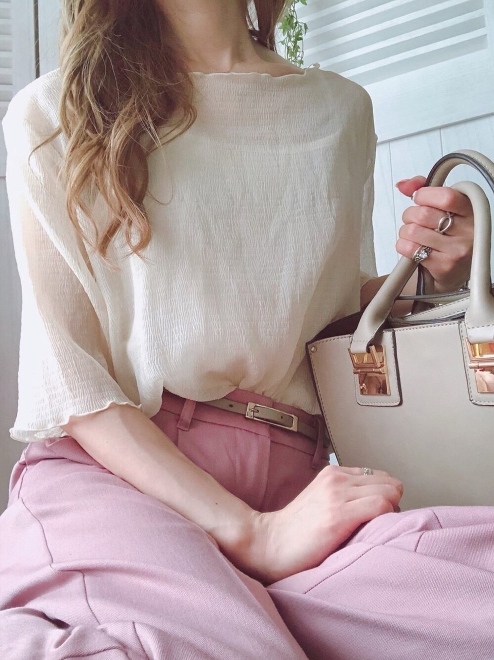 シアーのトップスはカラーパンツに 合わせて一枚でサラッと着ても、 キャミワンピースとレイヤードして 使っても映えるのでお気に入りです(^^) ボートネックでデコルテラインも 綺麗に見えます✨ メローデザインも好きです(´ `) 小物はグレージュの物に惹かれがちで つい集めてしまいます(. . )///