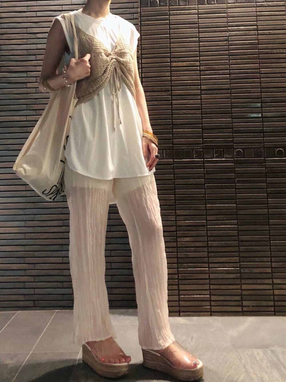 〈TOPS〉 かぎ針ビスチェ✕ノースリーブT のセットアイテム👕 〈BOTTOMS〉 Chicoのワッシャーパンツ スリットも入っていて、 シアー感がツボなパンツ(´ `) 〈BAG〉 TODAY’S SPECIALのマルシェバッグ リネンとポリタイプも持っていて 新しいのでるとつい買っちゃいます(^^)