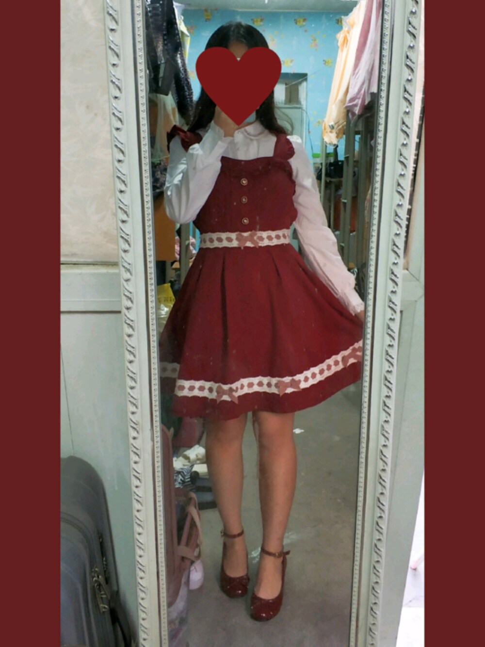 レッド系のジャンパースカートを着用したレディースの秋コーディネートの1枚目の写真