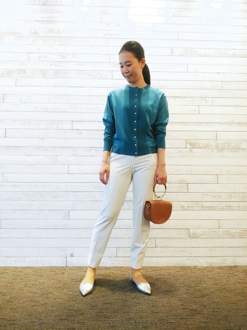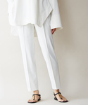 大人気のストレッチパンツに、 シルクのような肌ざわりのスビンコットン カーディガンを合わせました! カーディガンは、ボタンをしめて、 プルオーバーとして着るのがおすすめです。