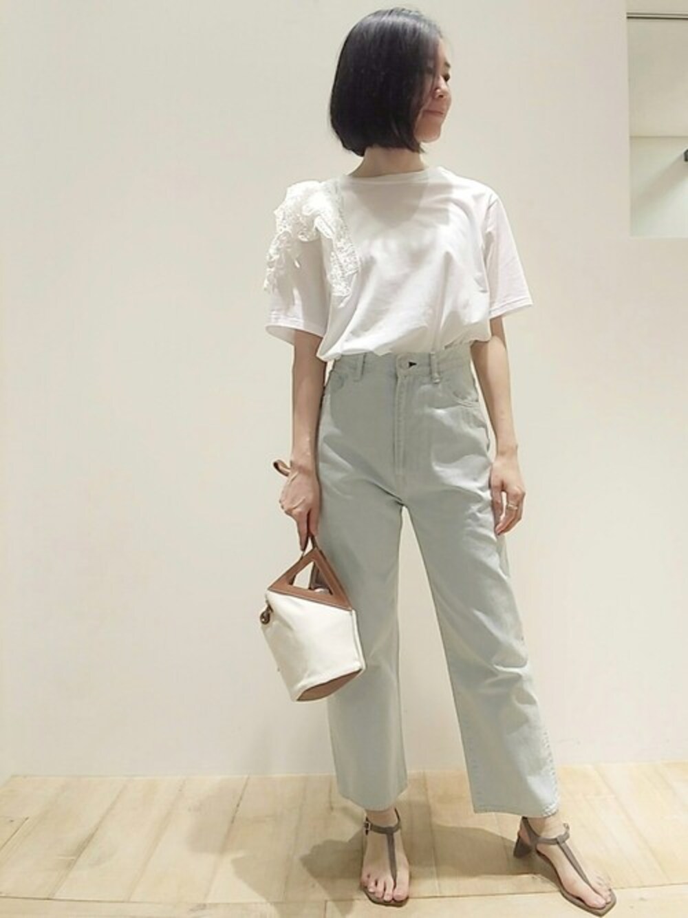 ショルダーレースTシャツにマリリンデニムを合わせました! オーバーサイズのTシャツで気になる腕のラインをカバー。モード感あるショルダーレースが存在感ばつぐんです。