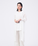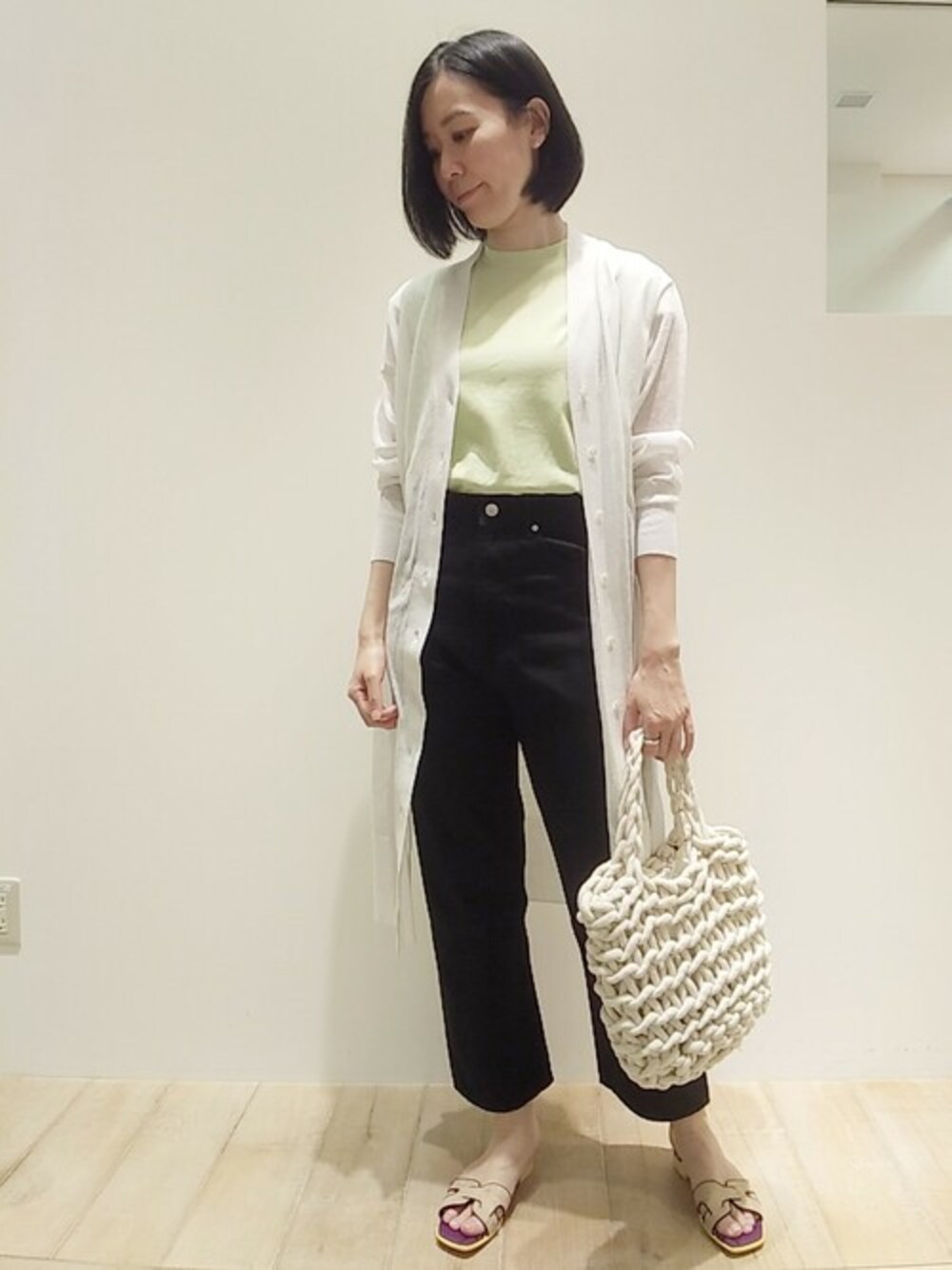 ブラックデニムに、ライム色のカットソー、ロングカーディガンを合わせました! 薄手で、透け感のあるカーディガンは真夏の羽織りにも最適です。