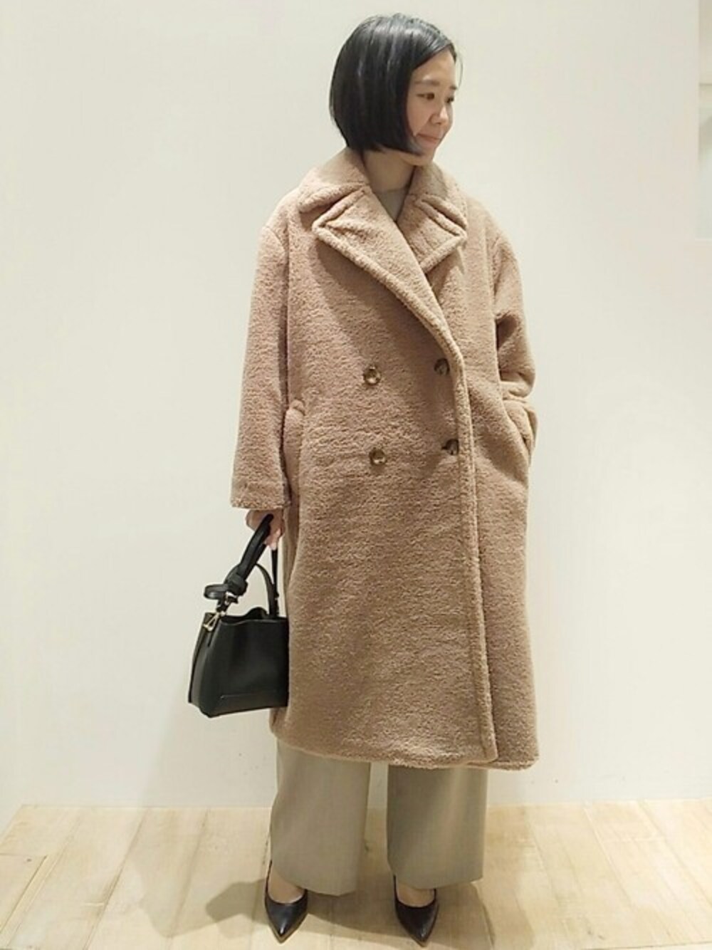 今年トレンドのボアコート!ボリュームのあるシルエットが特徴的です。ポケットの中まで暖かい仕様です。 ウール100%のフレアパンツと合わせました!