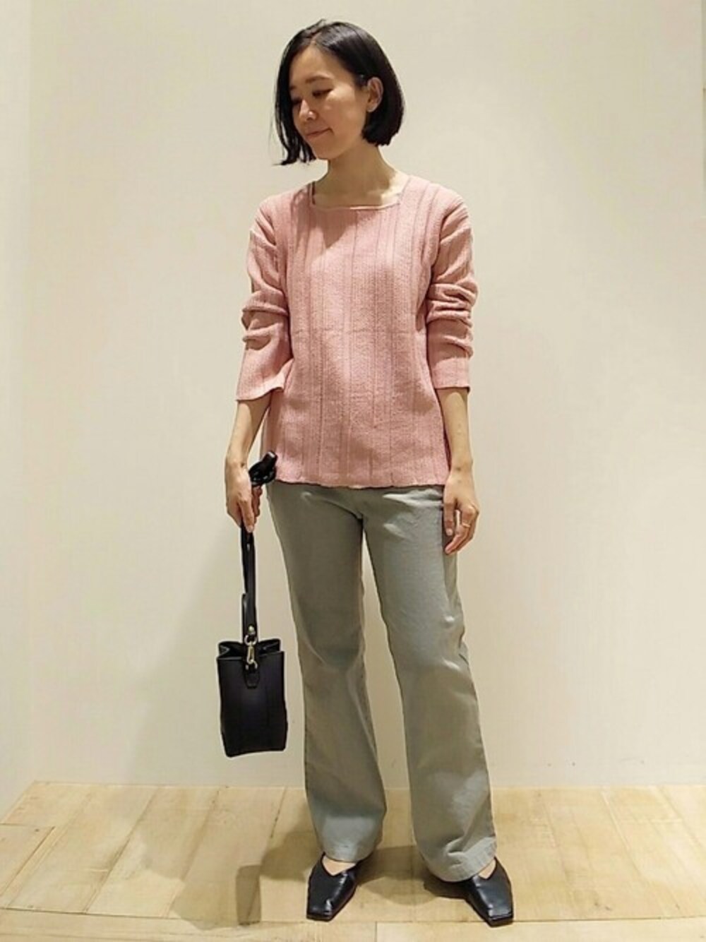 スクエアネックのニットに、カラーデニムを合わせました!スモークピンクの優しいカラーが冬のコーディネートを華やかにしてくれます。
