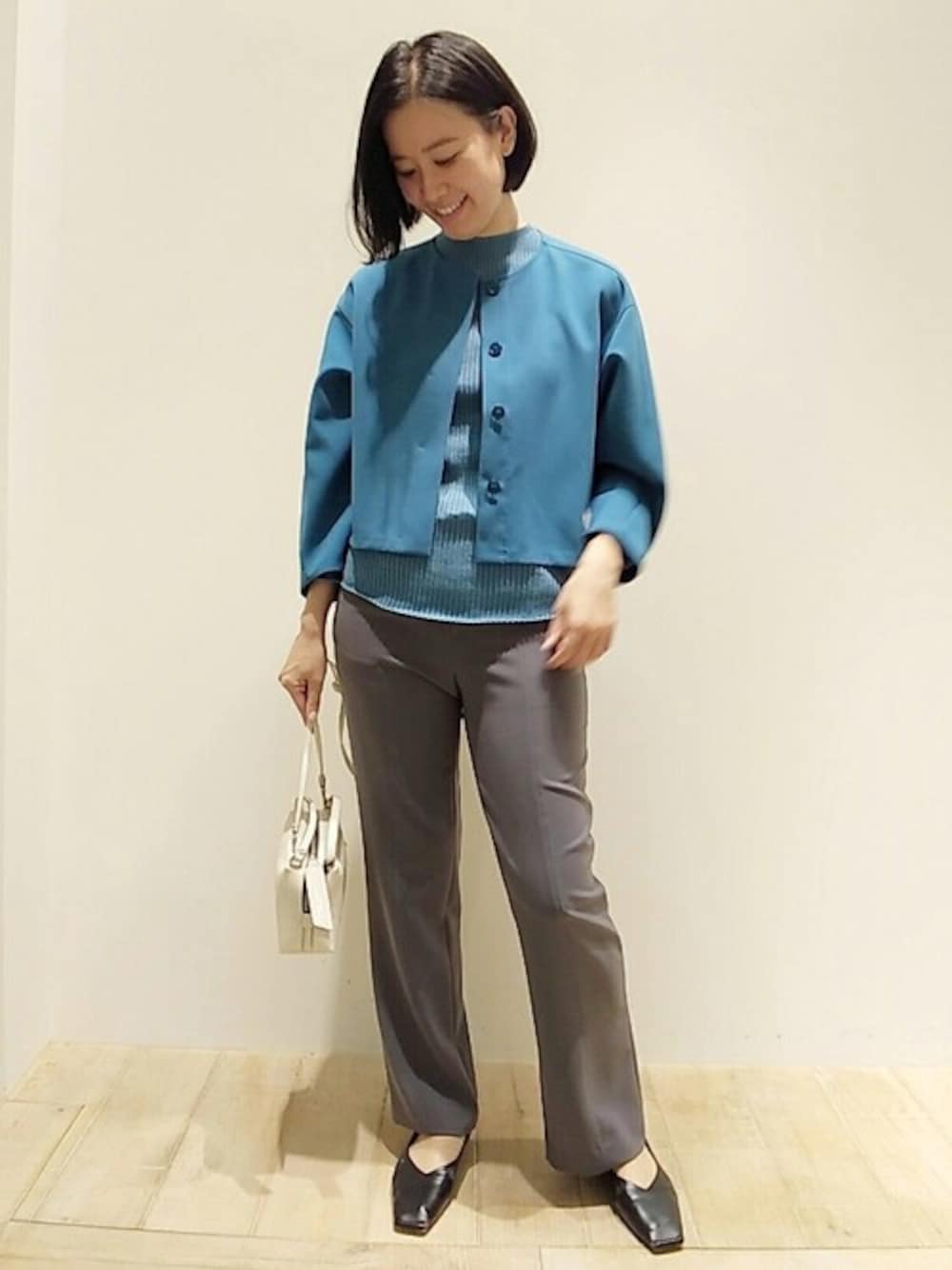 ブルー×ブルーでニットとジャケットを合わせ、グレー色のパンツでコーディネートしました! カラーコーデで冬のコーディネートを楽しみましょう!