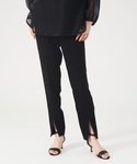 鮮やかなブルーのドレープブラウスに、センターにスリットの入ったスリムパンツを合わせました。スッキリしたシルエットのパンツは、脚の細身えが叶うスリムラインです。